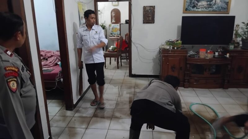 Personel Polres Wonosobo mendatangi lokasi kejadian banjir di Desa Blederan, Kecamatan Mojotengah, Kabupaten Wonosobo (2/12). Banjir yang diduga disebabkan oleh curah hujan yang tinggi dan luapan dari saluran irigasi di sekitar desa tersebut mengakibatkan beberapa rumah warga terendam.