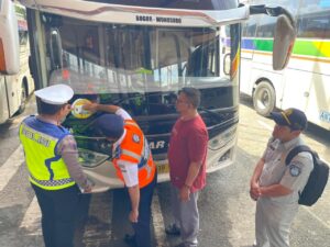 WONOSOBO – Satlantas Polres Wonosobo melaksanakan kegiatan rampcheck atau pemeriksaan kelaikan kendaraan bus dalam rangka Operasi Keselamatan Candi