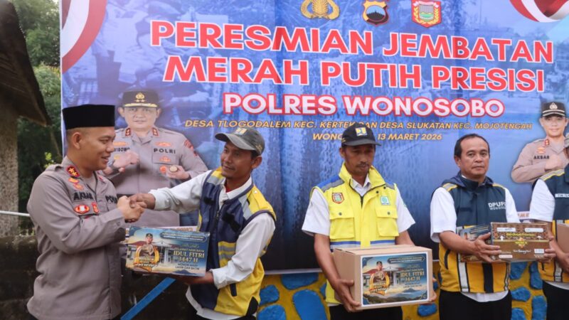 Wonosobo — Polres Wonosobo meresmikan Jembatan Merah Putih Presisi di Desa Tlogodalem, Kecamatan Kertek, Jumat, 13 Maret 2026. Peresmian yang berlangsung pukul 17.00 hingga 19.00 WIB itu juga menandai beroperasinya jembatan gantung di Desa Slukatan, Kecamatan Mojotengah.