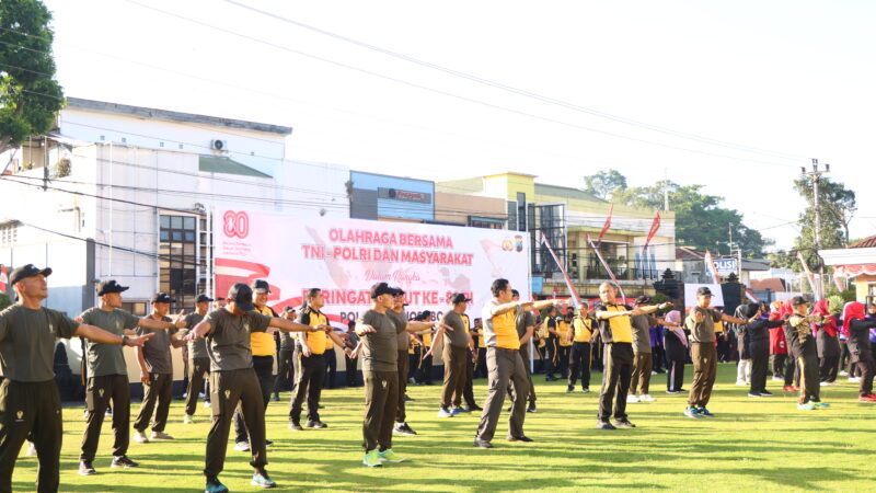 WONOSOBO – Dalam rangka memperingati Hari Ulang Tahun Kemerdekaan Republik Indonesia ke-80, Polres Wonosobo menggelar olahraga bersama TNI-Polri dan masyarakat di halaman Mapolres Wonosobo, Jumat (15/8/2025).