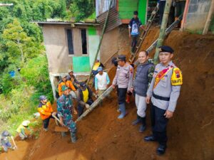 WONOSOBO – Tim Siaga Bencana Alam Polres Wonosobo bersama personel Satsamapta, Kapolsek Kejajar beserta anggota, serta warga masyarakat dan relawan Desa Surengede bergotong-royong melakukan pembersihan